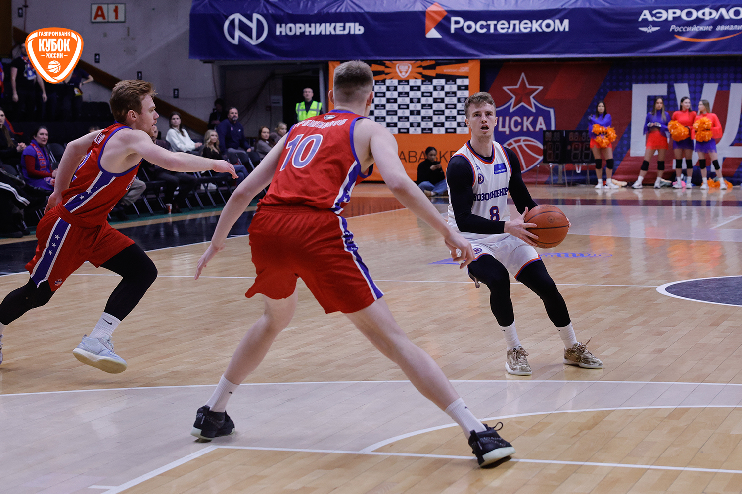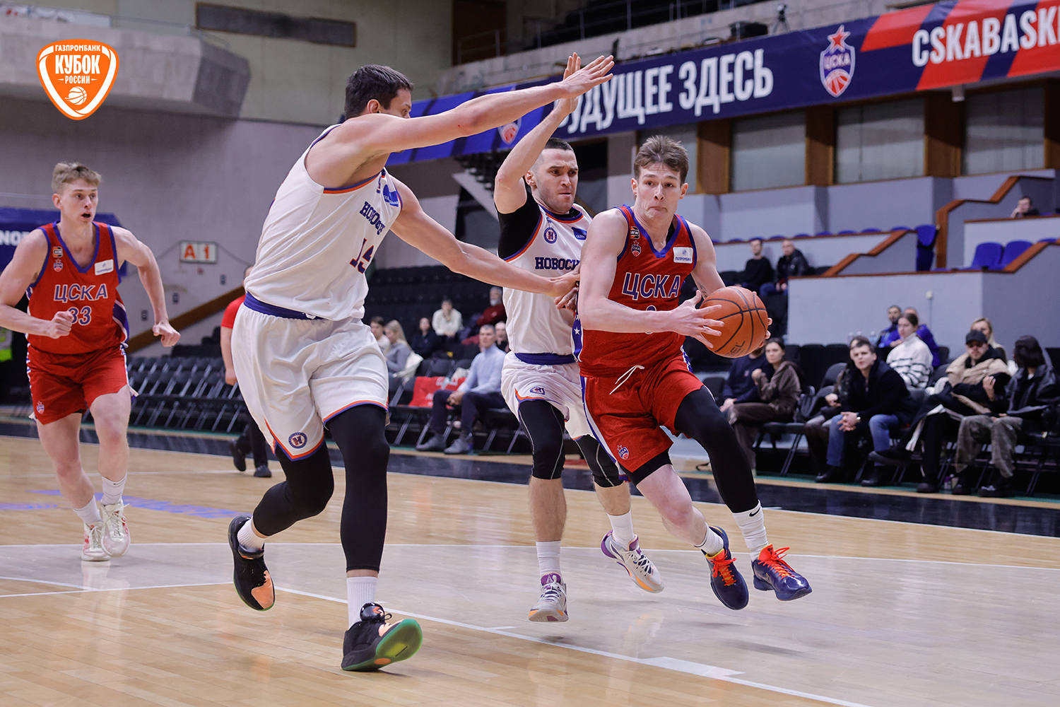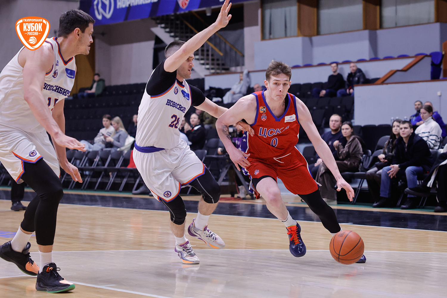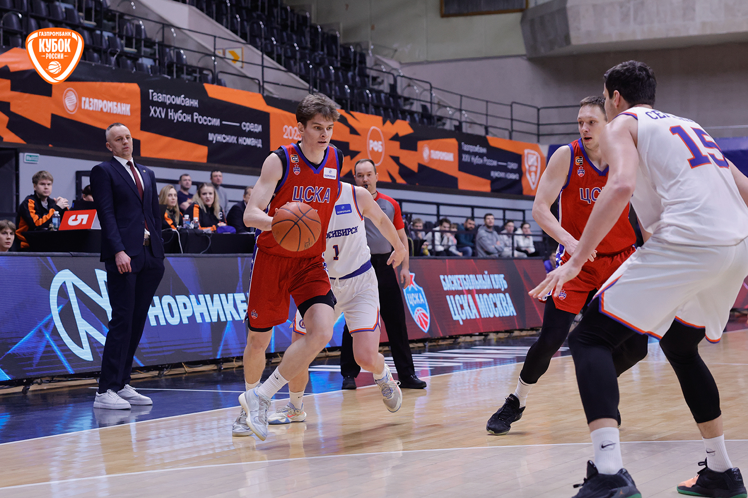 Красно-синие с первых секунд вышли максимально заряженными, сходу обозначив свои намерения. Егор Покинко взял игру на себя и открыл матч стремительным рывком 5:0, задав высокий темп встречи. Однако «Новосибирск» быстро погасил стартовый пыл хозяев, сравнял счет, а после точного броска со средней дистанции Артема Комиссарова гости и вовсе вышли вперед. С выходом Ивана Зайцева и Даниила Ключенкова армейцы стали действовать собраннее и увереннее, плотнее защищались и навязывали борьбу на каждом участке паркета. Красно-синие ненадолго выходили вперед, но новосибирцы тут же нивелировали отставание. «Трешка» Ярослава Никонова под занавес четверти «взорвала» трибуны, однако Комиссаров ответил тем же. Итог стартового отрезка - 19:17.