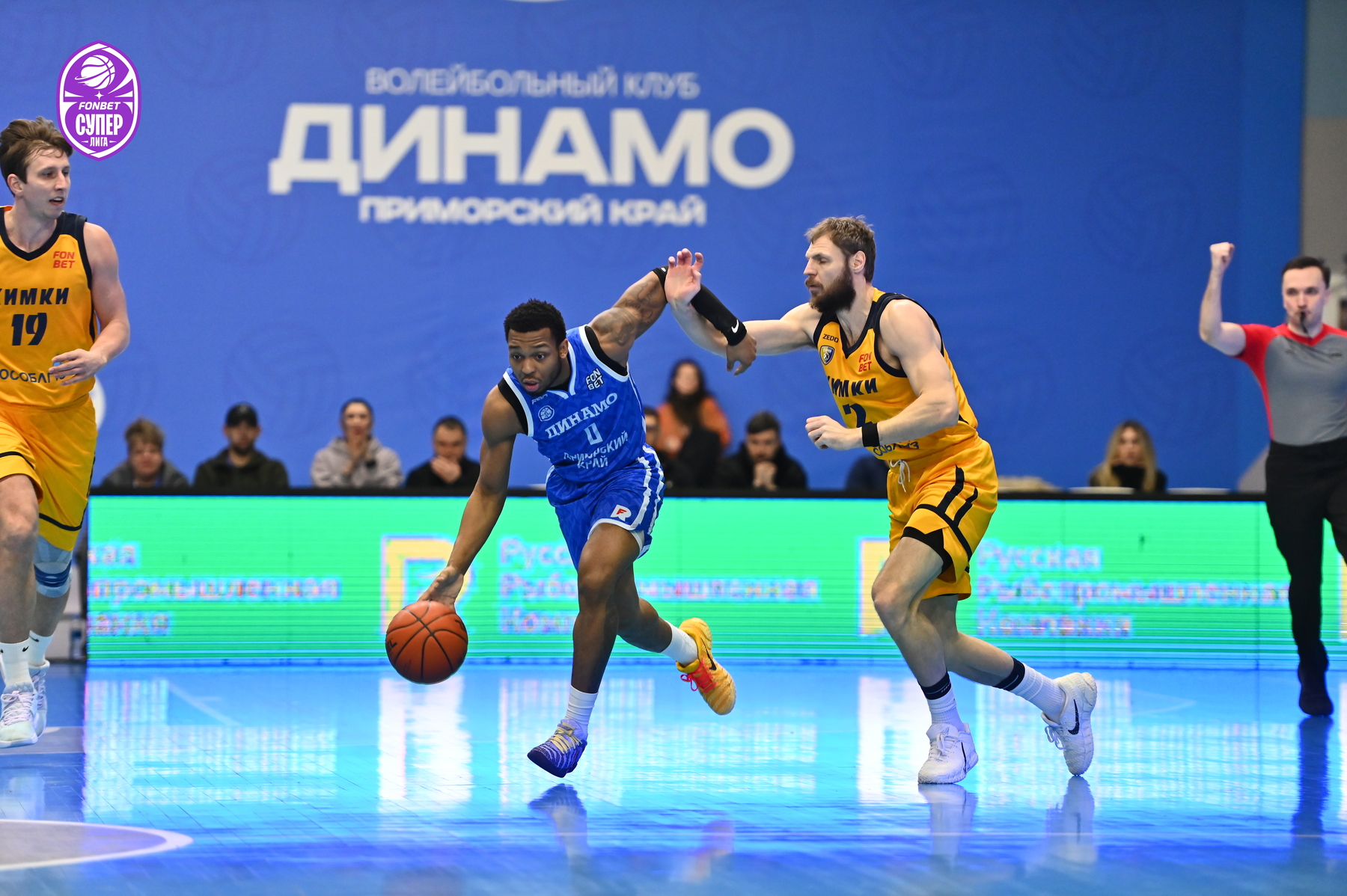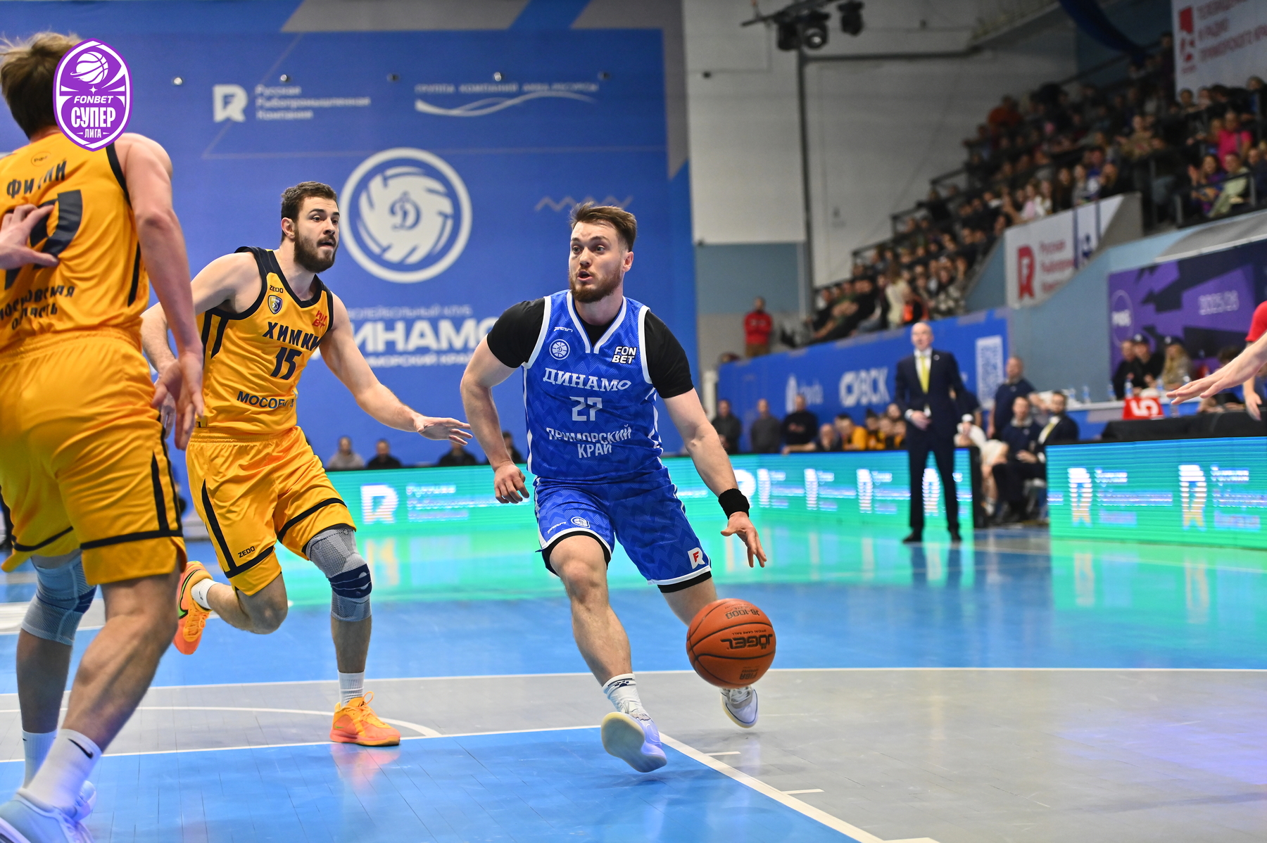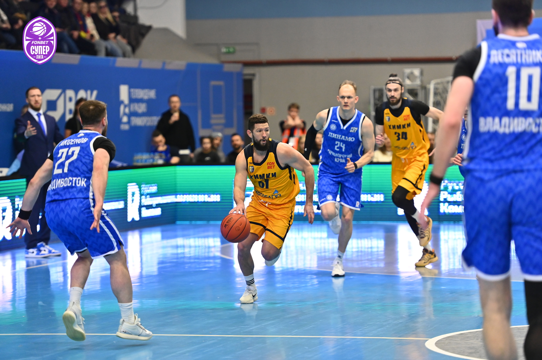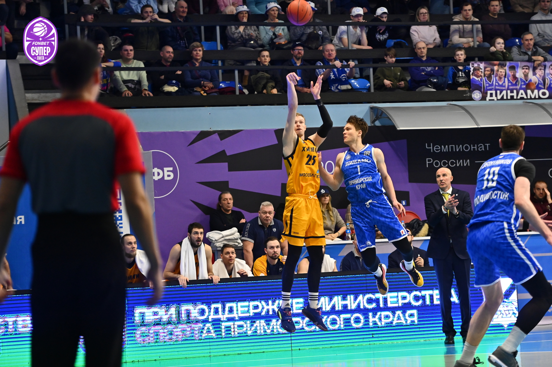 Уже за день до игры на поединок против «Химок» были раскуплены все билеты – принципиальнейшее противостояние приморские болельщики не пропускают. Ответственно к сопернику подошли и динамовцы – Аксёнов задал высокий тон игре, реализовав трёхочковый. Поначалу «Химки» не отставали, но бросок сверху Десятникова спровоцировал тайм-аут Романа Семернинова - 11:4. Смит быстро получил два фола, и вместо него вышел Стребков, который тут же набрал 5 очков кряду и отдал пас на Кроули, метко атаковавшему издали (19:6). Однако затем гости набрали 8 безответных очков - 19:14.