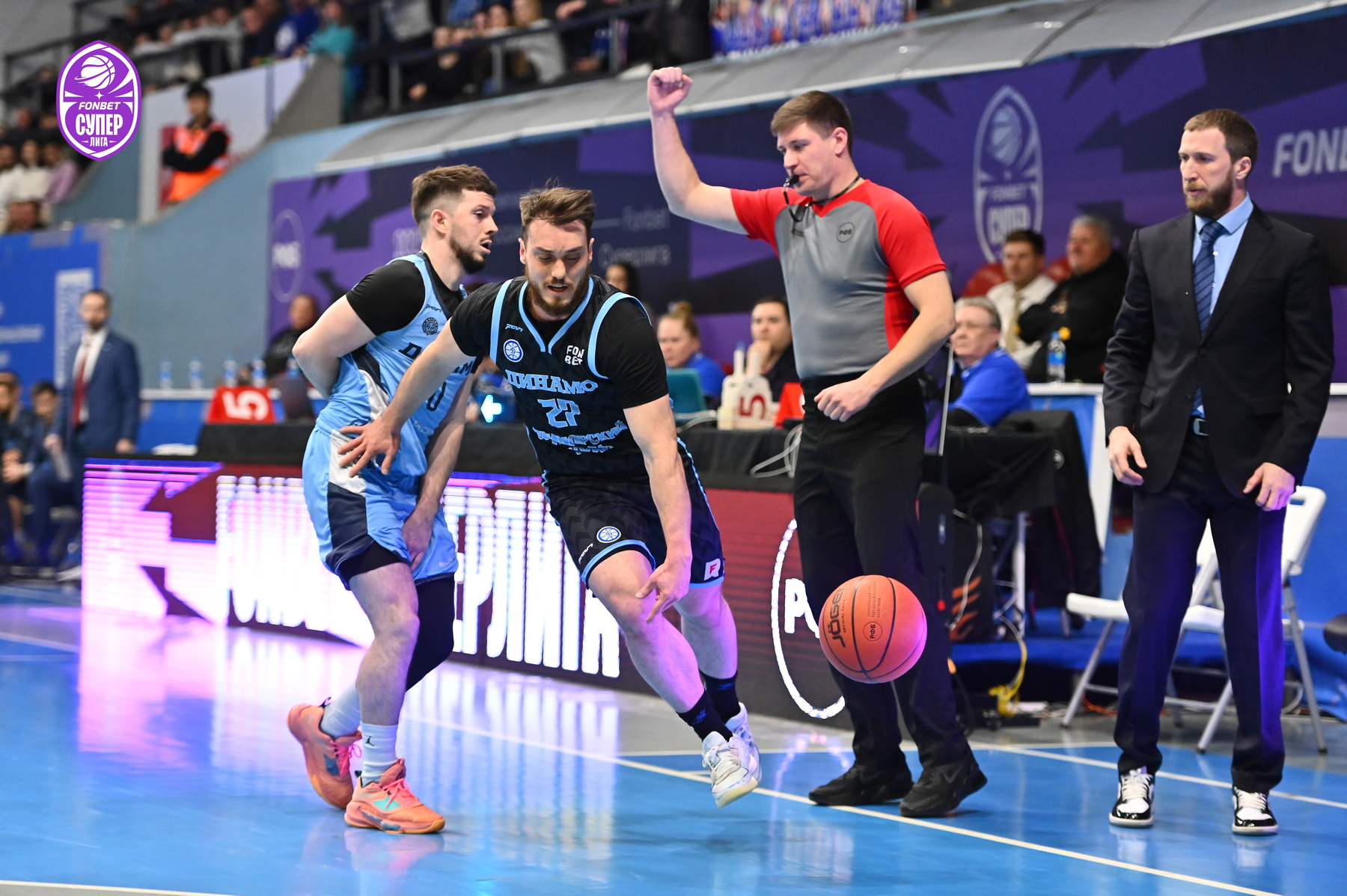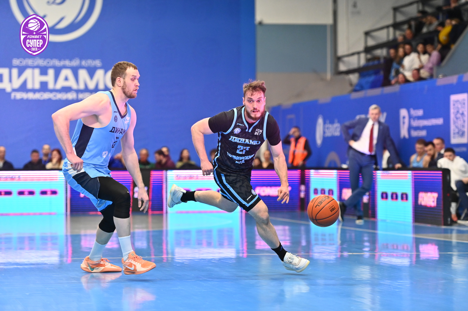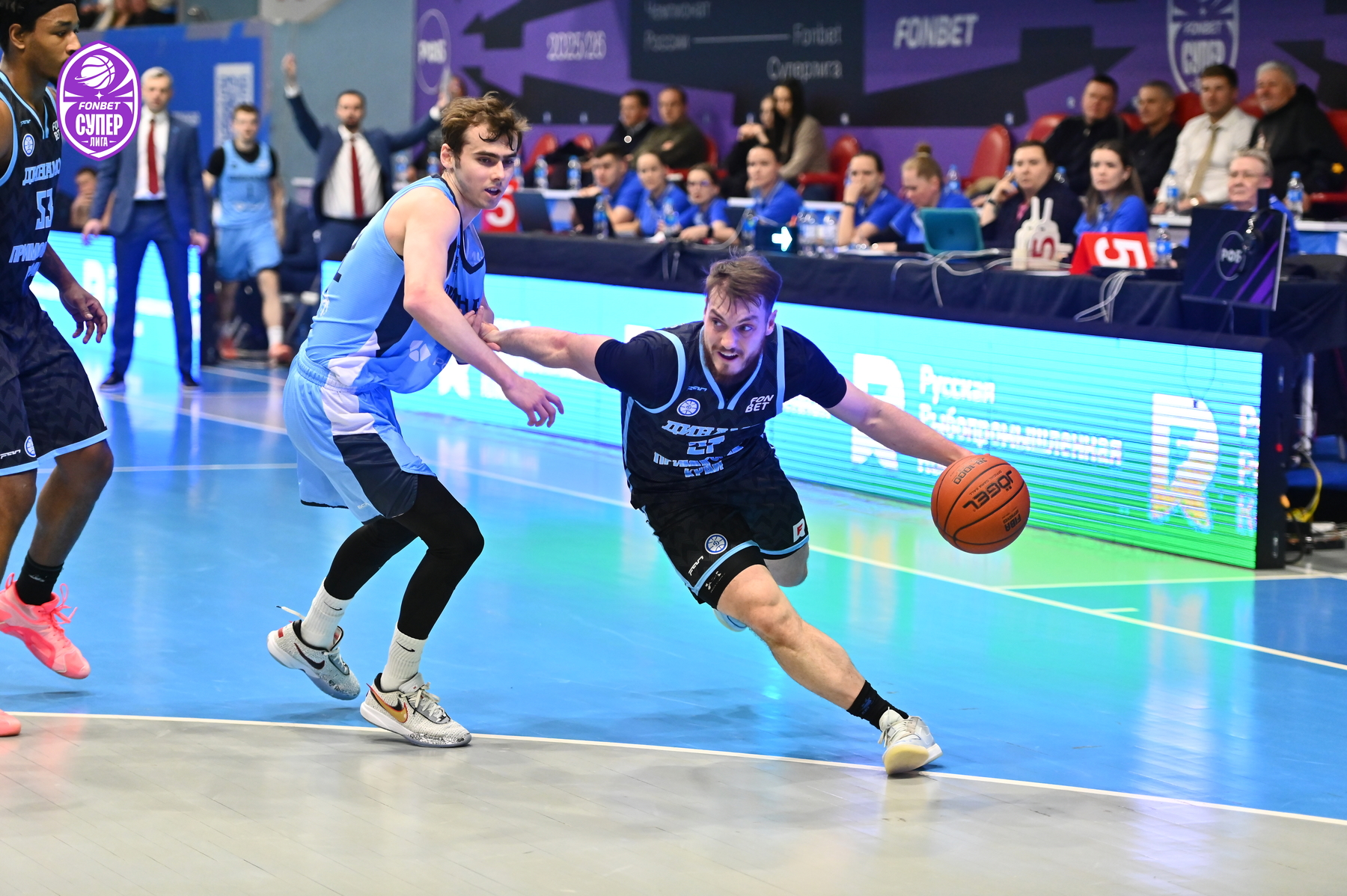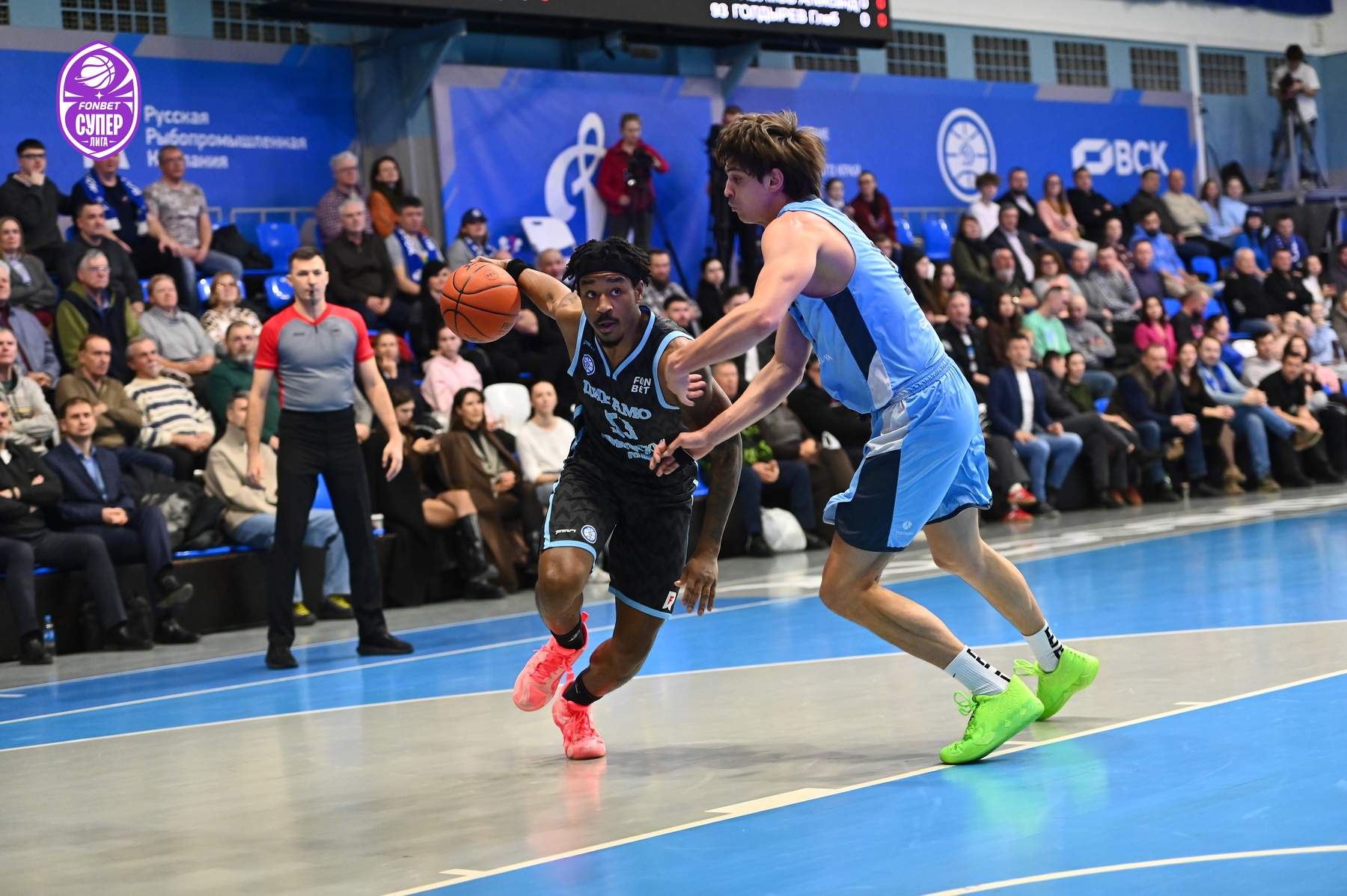 Зубков дважды попал из-за дуги и в начале второй четверти. У приморского «Динамо» трудности сопернику доставляли Кроули, Ершов, а также Смит, который вновь увел свою команду на дистанцию в «+9». Тогда повели за собой гостей Лавников, Умрихин и Топтунов – после дальнего попадания последнего разрыв сократился до 2 очков, и Эдуард Сандлер использовал тайм-аут. Команды до определённого момента шли нога в ногу, а перед большим перерывом устроили обмен трехочковыми: Аксенов и Денисов отличились у приморцев, у гостей - Бестужев (53:49).