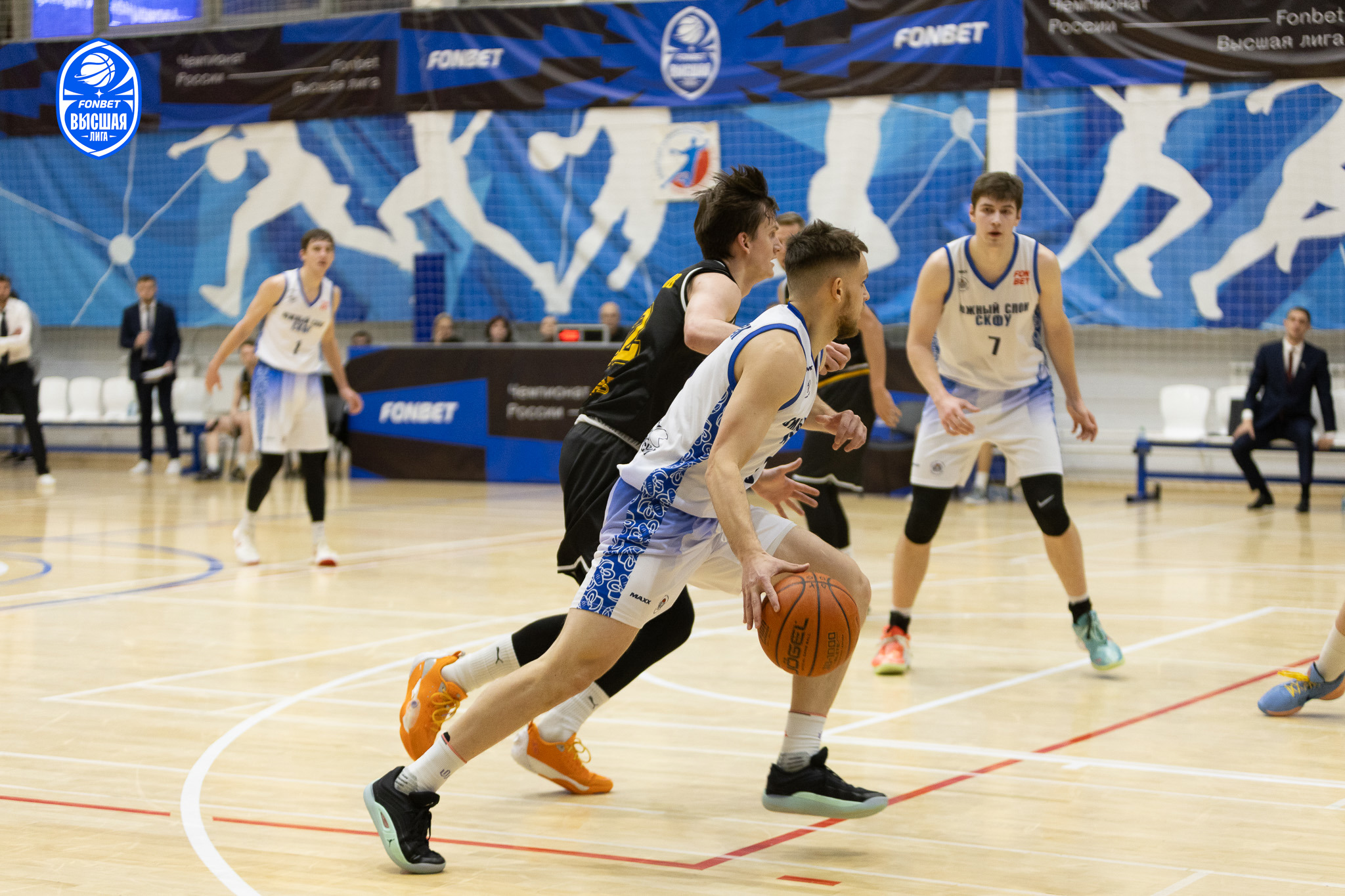 Стартовая четверть прошла в плотной борьбе. Команды действовали слаженно, уделяя внимание защите, и по итогам первых десяти минут счёт составил 34:26 в пользу хозяев площадки. Во втором игровом отрезке «ЦСП-Химки» добавили в скорости и агрессии в атаках. «Южный слон-СКФУ» отвечал за счёт командных взаимодействий. Счёт второй четверти был равным 23:23, но набранного преимущества в первом игровом отрезке «слонам» хватило для лидерства по итогам первой половины встречи — 57:49.