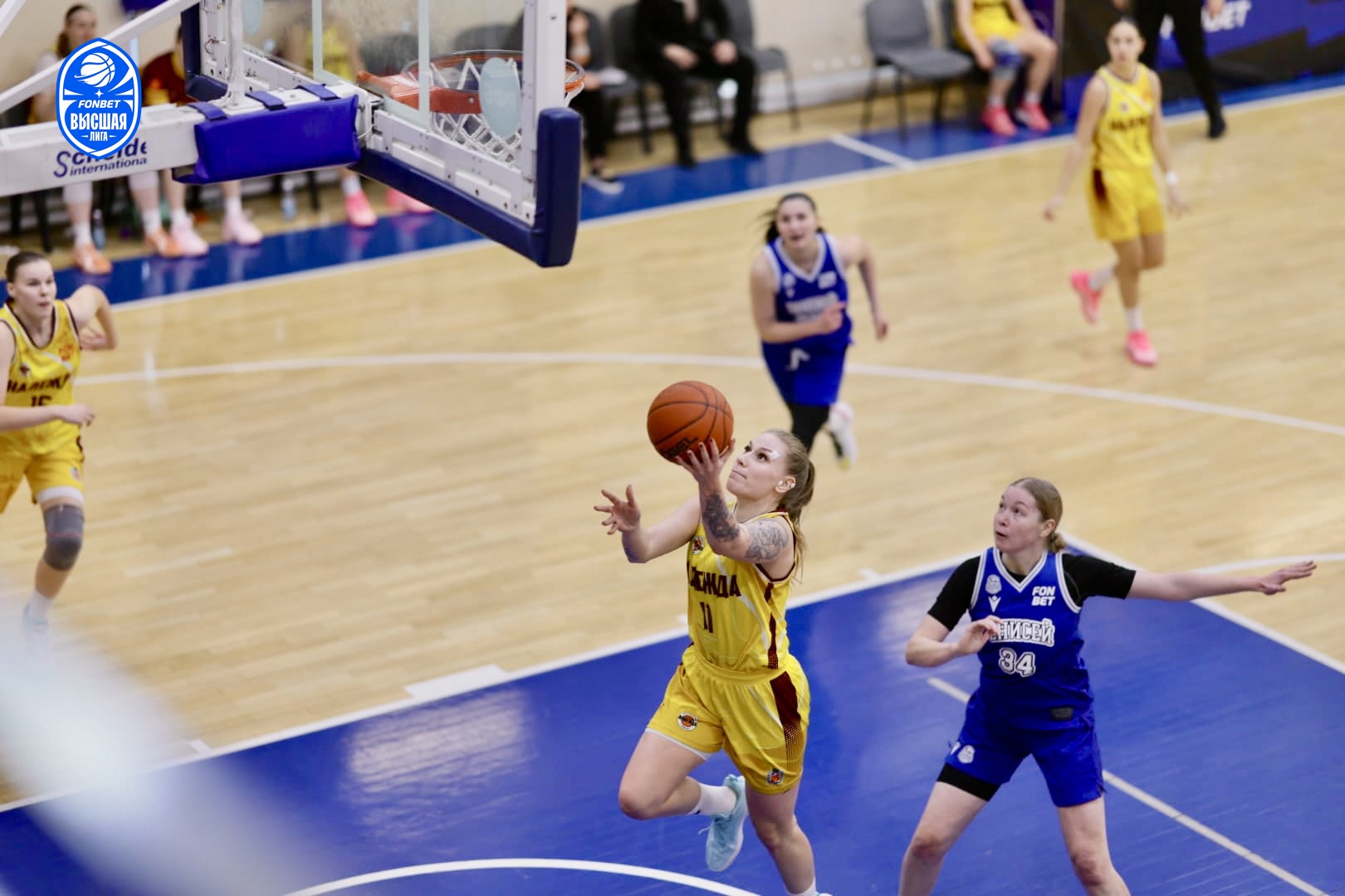 В начале первой четверти игра шла на равных. Каждая из команд планомерно набирала очки. К середине этой десятиминутки после попадания Анастасии Кашириной «Надежда» вырвалась вперед на 6 очков (15:9). Однако Дарья Кириленко из «Енисея-2» забила несколько трехочковых, которые помогли ее команде уйти на перерыв в роли лидеров 22:25. Вторая четверть отчасти повторила сценарий предыдущей и прошла в равной борьбе, что отразилось на игровом счете за четверть (19:19). Львиную долю очков своим командам приносили Софья Мурзанёва («Надежда-2») и Дарья Кириленко в составе «Енисея-2».