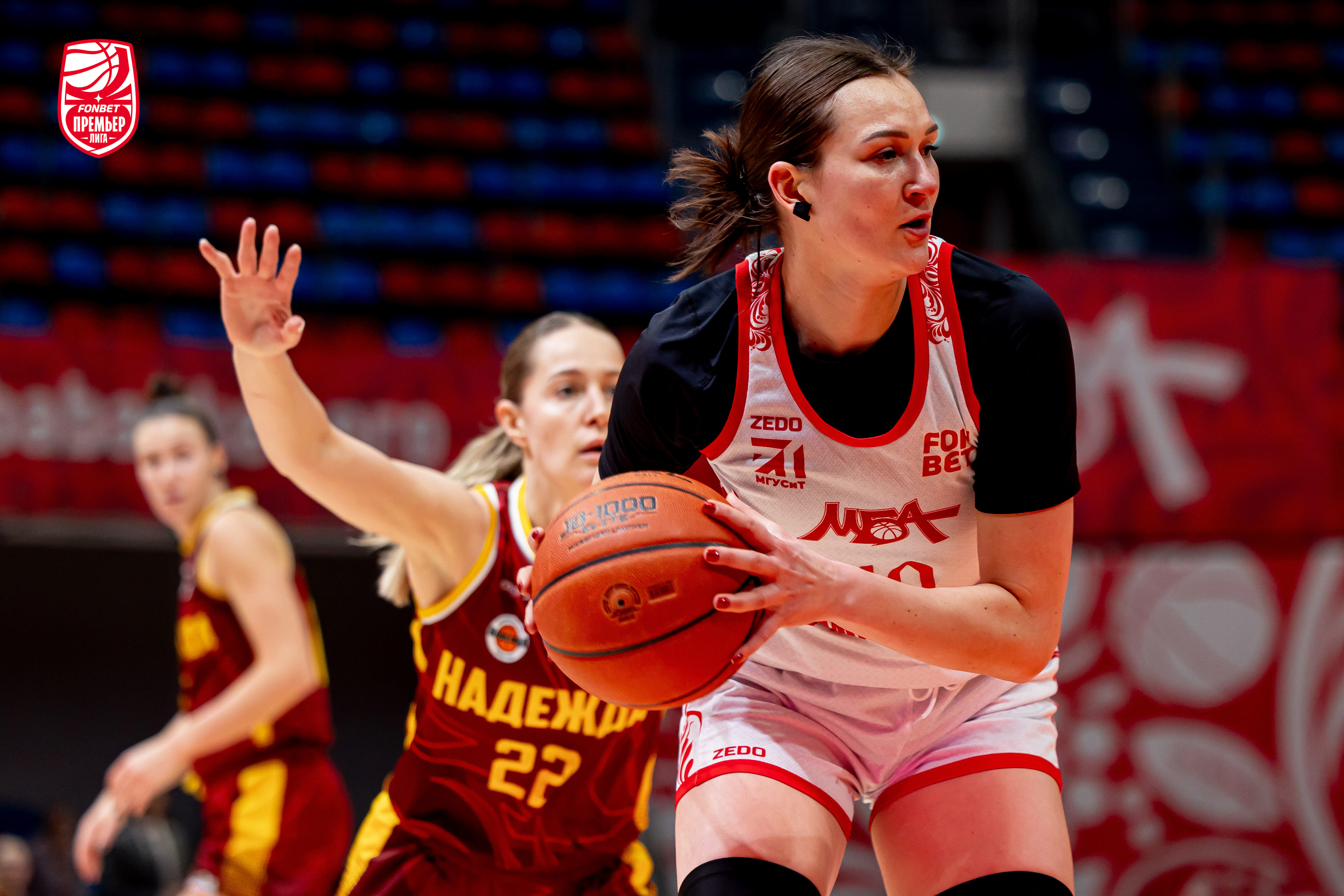На старте второй десятиминутки МБА-МГУСиТ бросилась отыгрываться и за несколько владений превратила «-10» в «-3». Развить успех москвички не смогли: «Надежда» включилась в защите, вновь стала регулярно набирать очки и вернула двузначную разницу. Качели на этом не закончились. Красно-белые начали очередную погоню и за 34 секунды до конца первой половины сравняли счёт. Правда, последнее слово в отрезке всё же осталось за гостями — в раздевалку они ушли при форе в 3 очка (40:37).