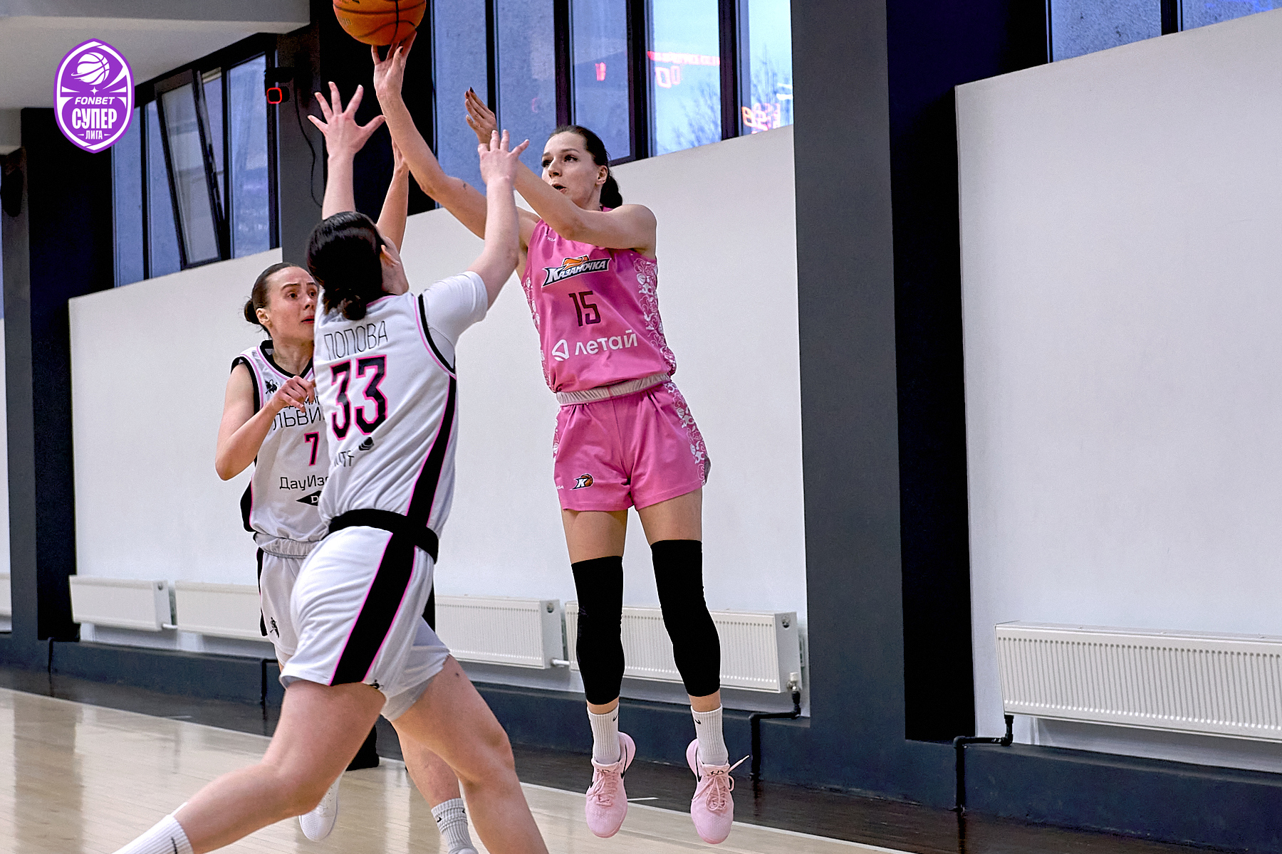 Третья четверть началась с попаданий обеих команд — лидерство чередовалось с разницей в одно очко, Светлана Крамар и Алина Леднёвой показывали борьбу на паркете. В первой пятиминутке стоит отметить Марию Антошину и её капитанские трёхочковые: три реализованных дальних броска за этот отрезок. Тайм-аут «Казаночки», и впереди ожидали ещё 4 минуты четверти (52:50). К этому моменту Мария Антошина реализовала 6 из 10 дальних бросков с игры, на её счету было уже 18 очков. На последней секунде Екатерина Карпук создала отрыв хозяек своим дальним броском в 8 очков! Счёт после третьей четверти — 64:56.